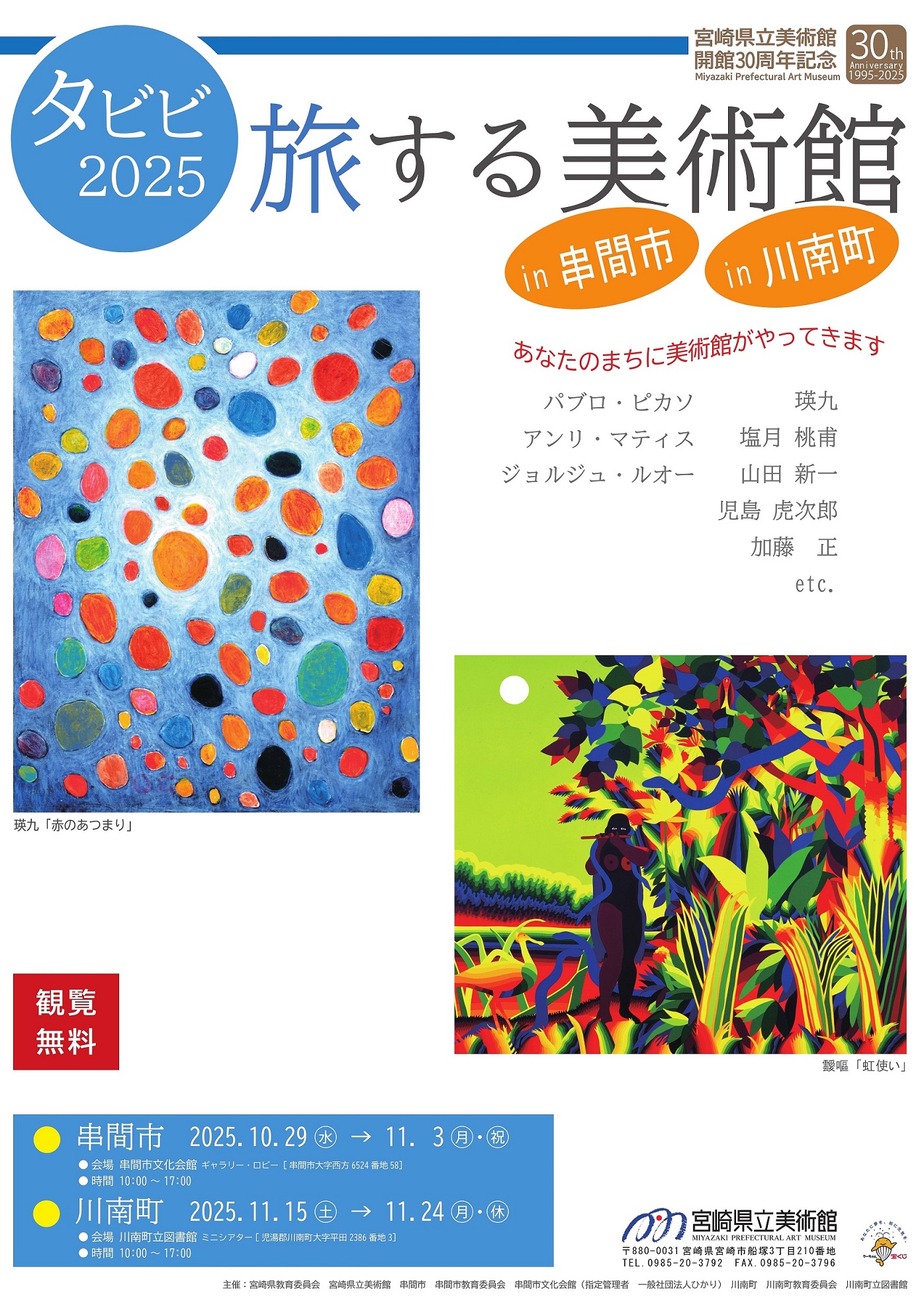 宮崎県立美術館では、多くの県民の皆様に身近な場所で 本物の美術作品に親しんでいただけるよう、収蔵作品を県内各地で展示・紹介する「旅する美術館」を開催しています。今年度は、串間市と川南町で開催することになりました。 くわしくはこちらをご覧ください 旅する美術館チラシ表 旅する美術館チラシ裏 ![]() 瑛九「赤のあつまり」 ![]() アンリ・マティス「馬・曲馬師・道化」