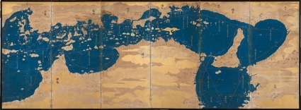 九州北部沿岸から瀬戸内海の航路を描いた屏風です。航路は朱線で表しています。一般的な屏風と比べ、この「九州瀬戸内航路絵図」は小振りで、参勤交代で大名が瀬戸内を船で移動する際に、船中で使用していたともいわれています。