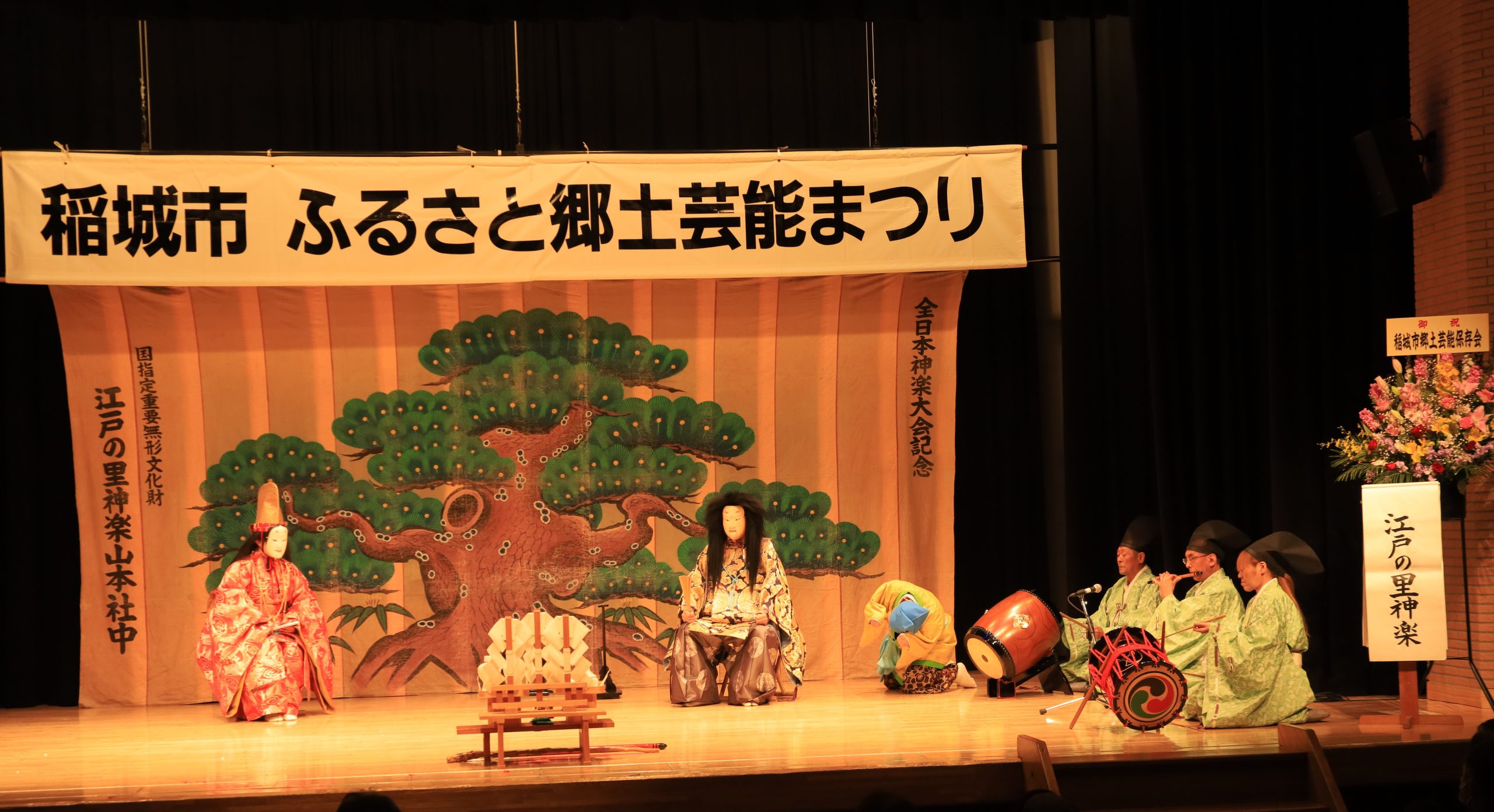 稲城市内で活動している郷土芸能10団体が一堂に会して、それぞれの地域に根ざした伝統的な郷土芸能の公演を行いました。国指定重要無形民俗文化財の「江戸の里神楽(山本社中)」では演目「天之浮橋」が公演され、普段は神社の祭礼でしか見ることのできない貴重な演目を見学できる機会となりました。