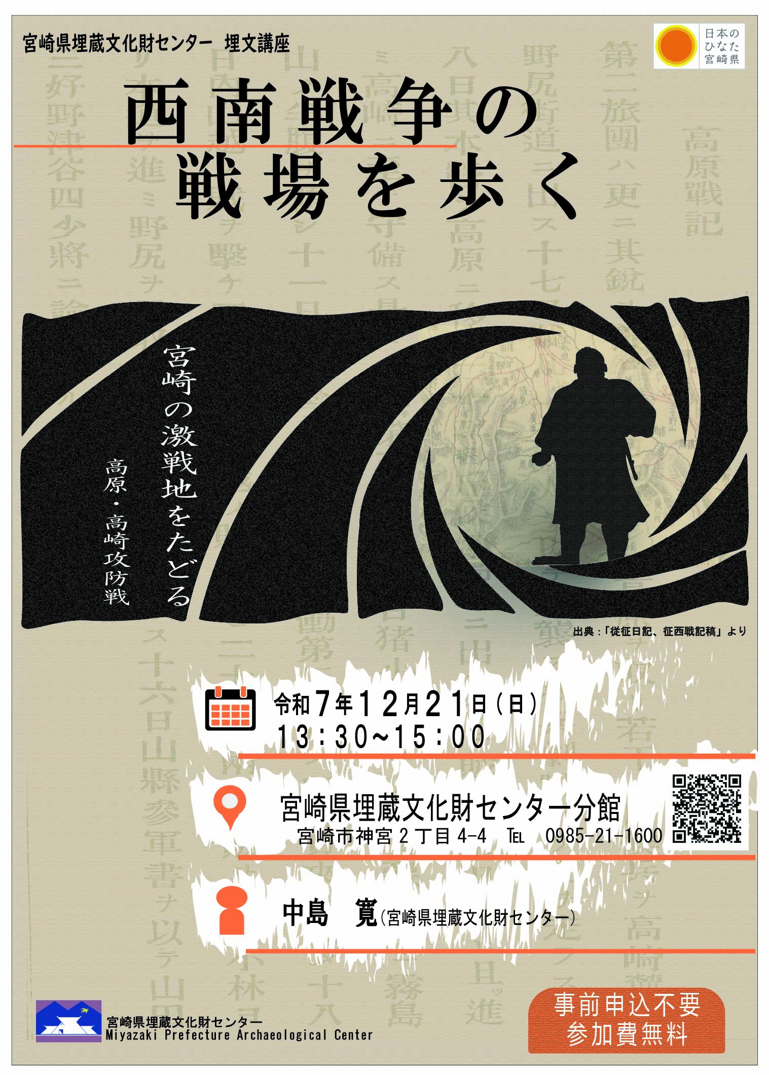 今回の講座では、西南戦争における高原町・都城市高崎町を中心とした県西の戦闘経過を調査の結果を交えて解説していきます。また、西南戦争に関連する展示も行います。ぜひ、ご参加ください。